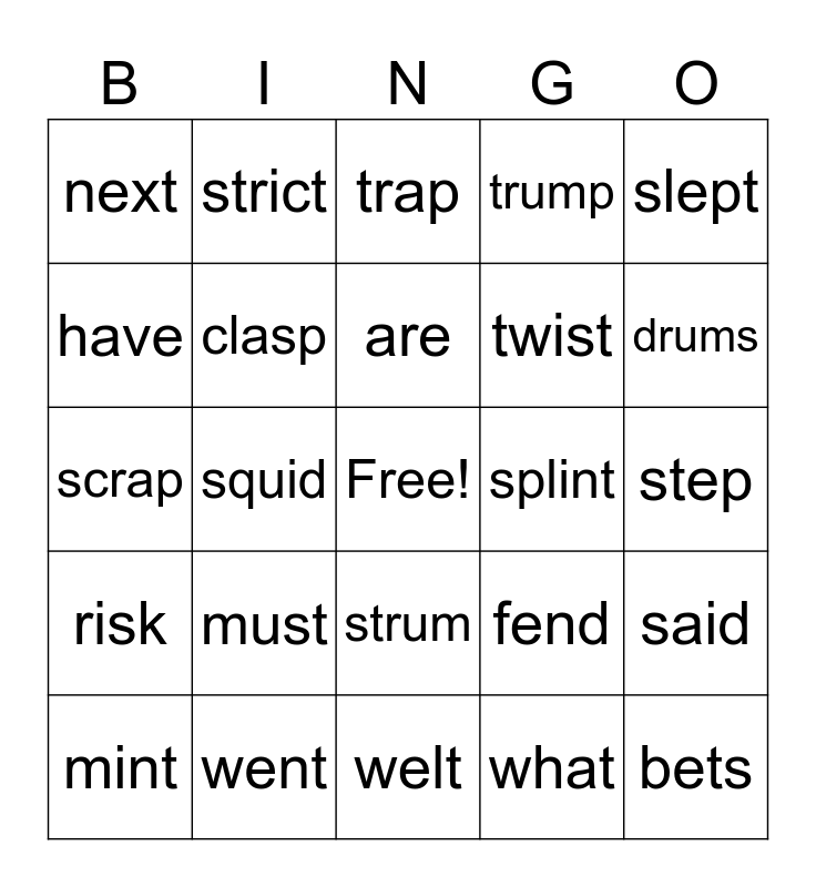 This bingo card has a free space and 44 words: bland, must, stud, what, hum, want, clasp, rust, trump, bets, next, went, fend, step, from, mend, welt, splint, clump, scrap, strict, strum, quest, slept, fret, pegs, are, blob, said, mint, crept, trap, bond, grand, risk, stomps, draft, strums, drums, have, squid, trend, twist and frond.