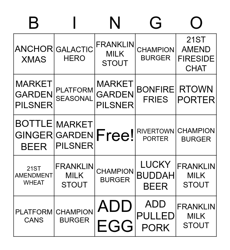 This bingo card has a free space and 24 words: FRANKLIN MILK STOUT, CHAMPION BURGER, MARKET GARDEN PILSNER, PLATFORM CANS, 21ST AMEND FIRESIDE CHAT, ANCHOR XMAS, MARKET GARDEN PILSNER, GALACTIC HERO, RIVERTOWN PORTER, CHAMPION BURGER, BONFIRE FRIES, BOTTLE GINGER BEER, LUCKY BUDDAH BEER, FRANKLIN MILK STOUT, PLATFORM SEASONAL, ADD PULLED PORK, CHAMPION BURGER, FRANKLIN MILK STOUT, RTOWN PORTER, MARKET GARDEN PILSNER, FRANKLIN MILK STOUT, 21ST AMENDMENT WHEAT, CHAMPION BURGER and ADD EGG.