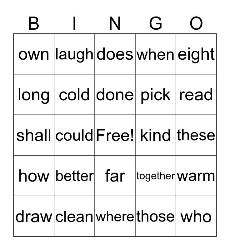 This bingo card has a free space and 24 words: better, clean, done, draw, eight, own, long, laugh, kind, far, pick, shall, together, warm, cold, those, these, does, read, could, who, how, when and where.