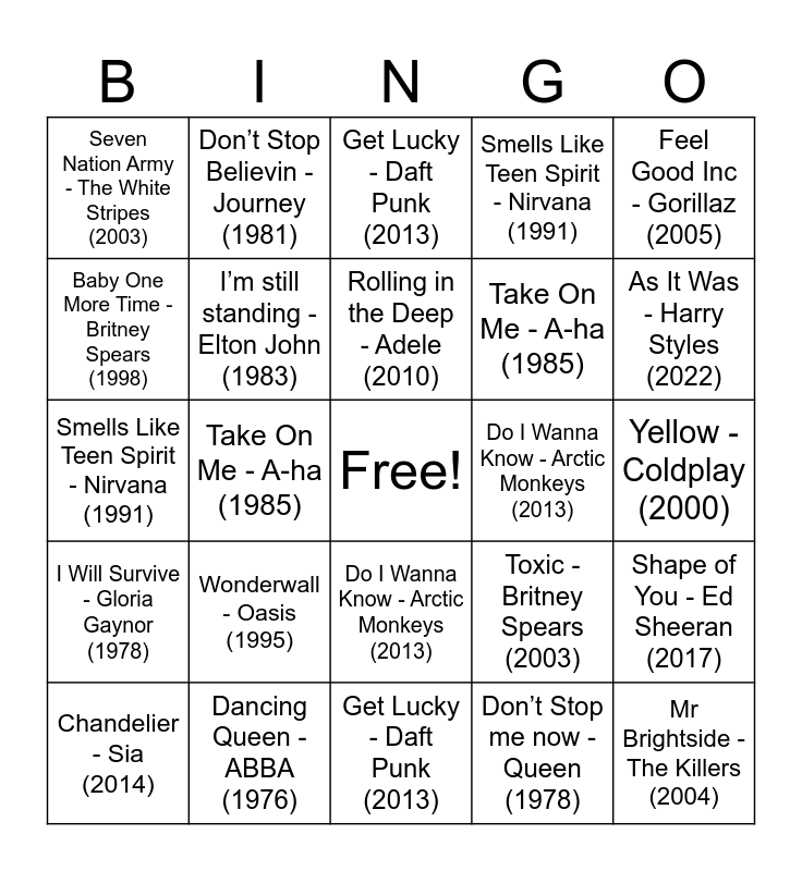 ⚠ This card has duplicate items: Come Together - The Beatles (1969) (2), Dancing Queen - ABBA (1976) (2), Stayin Alive - Bee Gees (1977) (2), Don’t Stop me now - Queen (1978) (2), Don’t Stop Believin - Journey (1981) (2), I’m still standing - Elton John (1983) (2), Billie Jean - Michael Jackson (1983) (2), Take On Me - A-ha (1985) (2), Enter Sandman - Metallica (1991) (2), Smells Like Teen Spirit - Nirvana (1991) (2), Wonderwall - Oasis (1995) (2), Yellow - Coldplay (2000) (2), Hey Ya - Outkast (2003) (2), Seven Nation Army - The White Stripes (2003) (2), Mr Brightside - The Killers (2004) (2), I gotta feeling - The Black Eyed Peas (2009) (2), Rolling in the Deep - Adele (2010) (2), Do I Wanna Know - Arctic Monkeys (2013) (2), Get Lucky - Daft Punk (2013) (2), Chandelier - Sia (2014) (2), Shape of You - Ed Sheeran (2017) (2), Old Town Road - Lil Nas X (2018) (2), bad guy - Billie Eilish (2019) (2), Cruel Summer - Taylor Swift (2019) (2), Levitating - Dua Lipa (2020) (2), As It Was - Harry Styles (2022) (2), vampire - Olivia Rodrigo (2023) (2)