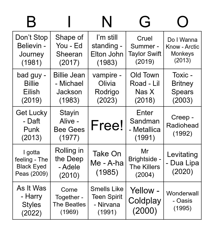 This bingo card has a free space and 30 words: Come Together - The Beatles (1969), Dancing Queen - ABBA (1976), Stayin Alive - Bee Gees (1977), Don’t Stop me now - Queen (1978), Don’t Stop Believin - Journey (1981), I’m still standing - Elton John (1983), Billie Jean - Michael Jackson (1983), Take On Me - A-ha (1985), Enter Sandman - Metallica (1991), Smells Like Teen Spirit - Nirvana (1991), Creep - Radiohead (1992), Wonderwall - Oasis (1995), Yellow - Coldplay (2000), Hey Ya - Outkast (2003), Toxic - Britney Spears (2003), Seven Nation Army - The White Stripes (2003), Mr Brightside - The Killers (2004), I gotta feeling - The Black Eyed Peas (2009), Rolling in the Deep - Adele (2010), Do I Wanna Know - Arctic Monkeys (2013), Get Lucky - Daft Punk (2013), Chandelier - Sia (2014), Shape of You - Ed Sheeran (2017), Old Town Road - Lil Nas X (2018), bad guy - Billie Eilish (2019), Cruel Summer - Taylor Swift (2019), Levitating - Dua Lipa (2020), As It Was - Harry Styles (2022), vampire - Olivia Rodrigo (2023) and Flowers - Miley Cyrus (2023).