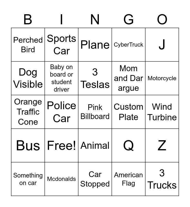 This bingo card has 25 words: Free!, Car Stopped, 3 Teslas, Something on car, J, Perched Bird, Dog Visible, Sports Car, Custom Plate, Animal, Mom and Dar argue, Orange Traffic Cone, Q, Z, Baby on board or student driver, 3 Trucks, Wind Turbine, Plane, Motorcycle, Police Car, Pink Billboard, Mcdonalds, Bus, CyberTruck and American Flag.