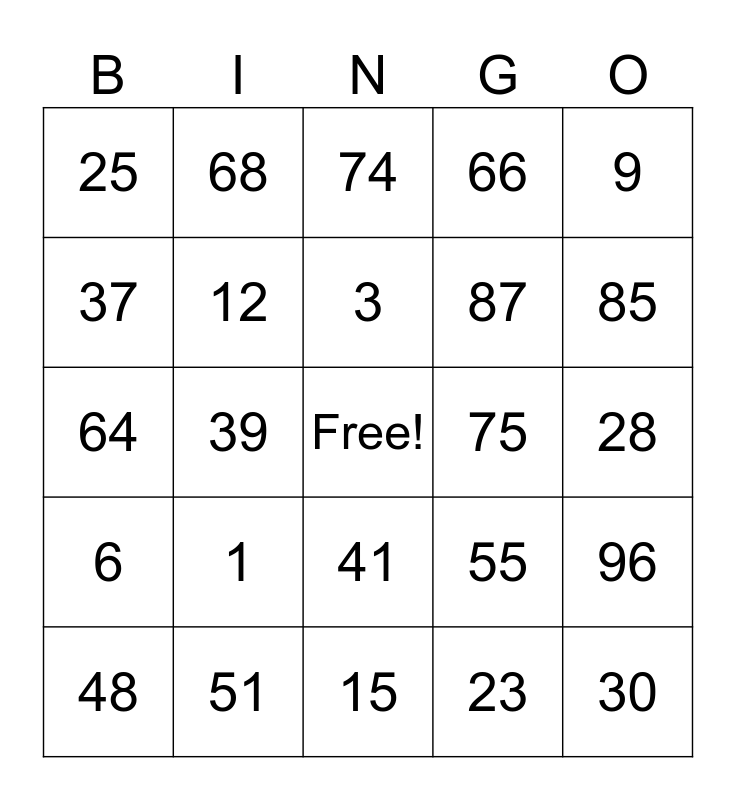 This bingo card has a free space and 25 words: 1, 15, 3, 48, 9, 25, 37, 68, 75, 41, 87, 64, 55, 96, 12, 33, 28, 74, 85, 39, 30, 51, 6, 66 and 23.