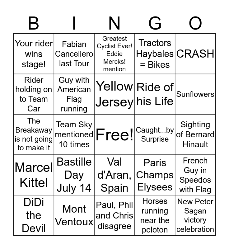 This bingo card has a free space and 24 words: Bastille Day July 14, Mont Ventoux, Yellow Jersey, DiDi the Devil, CRASH, Your rider wins stage!, Rider holding on to Team Car, Fabian Cancellero last Tour, Caught...by Surprise, Val d'Aran, Spain, Ride of his Life, The Breakaway is not going to make it, Paris Champs Elysees, French Guy in Speedos with Flag, Guy with American Flag running, Horses running near the peloton, Sighting of Bernard Hinault, Greatest Cyclist Ever! Eddie Mercks! mention, Sunflowers, Team Sky mentioned 10 times, New Peter Sagan victory celebration, Marcel Kittel, Tractors Haybales = Bikes and Paul, Phil and Chris disagree.