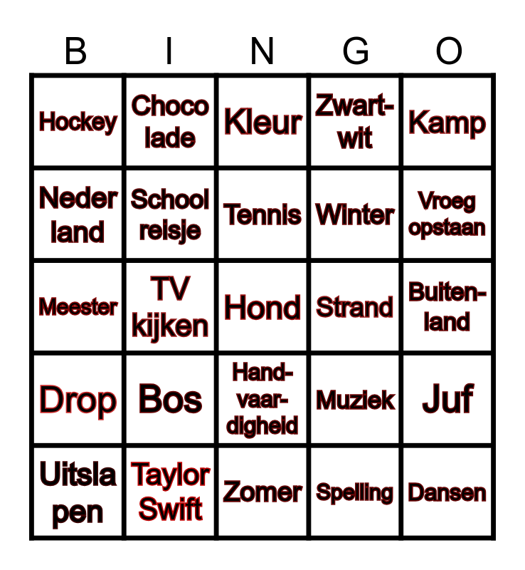 This bingo card has 25 words: Drop, Taylor Swift, Hond, Spelling, Kamp, Hockey, Choco lade, Kleur, Strand, Juf, Neder land, School reisje, Zomer, Muziek, Vroeg opstaan, Uitsla pen, TV kijken, Tennis, Winter, Buiten- land, Meester, Bos, Hand- vaar- digheid, Zwart- wit and Dansen.