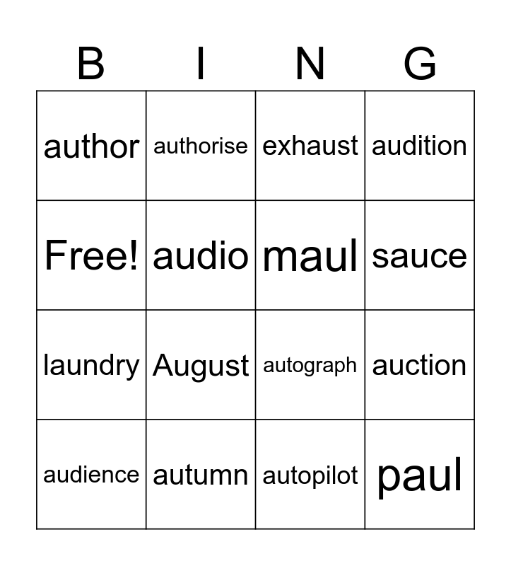 This bingo card has 16 words: autumn, auction, exhaust, author, laundry, authorise, autograph, autopilot, Free!, audio, audience, audition, August, sauce, maul and paul.