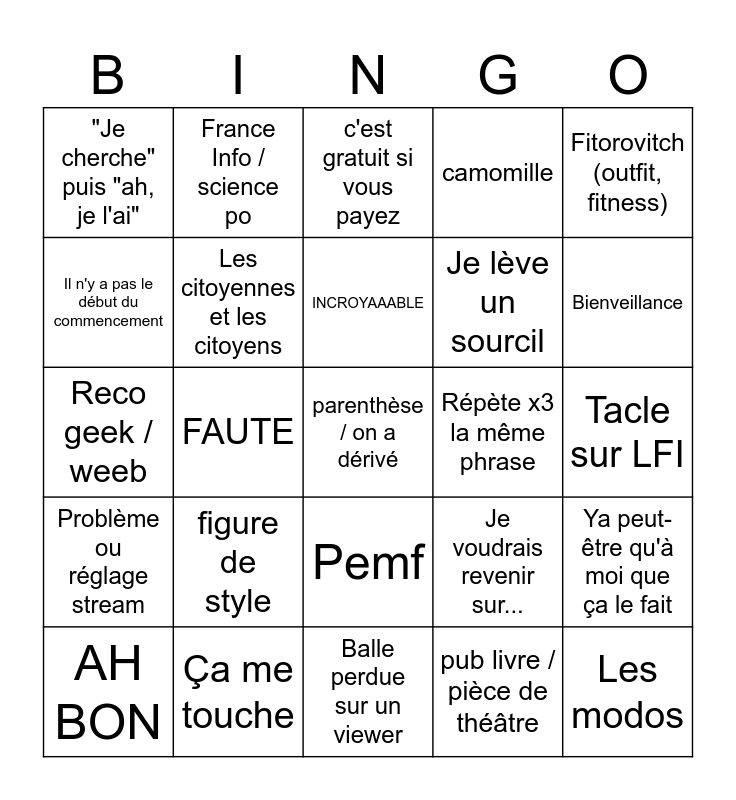 This bingo card has 44 words: MAIS... / ...OU PAS, parenthèse / on a dérivé, claqué au sol / éclaté, AH BON, Je suis fatigué, pub livre / pièce de théâtre, c'est gratuit si vous payez, annonce / projet, Fitorovitch (outfit, fitness), Ça me touche, camomille, Répète x3 la même phrase, Pemf, figure de style, Une dingz, Balle perdue sur un viewer, COMBIEN?!, Reco geek / weeb, 15min de talk pour 1min de vidéo, Bienveillance, France Info / science po, Mon chat (hippias), Tuto astuce, "Je cherche" puis "ah, je l'ai", Roublard, Tacle sur LFI, Les algorithmes, Ref au bingo, Je voudrais revenir sur..., Problème ou réglage stream, Flex stats, Ya peut-être qu'à moi que ça le fait, La guitare ma passion, Train de la hype, FAUTE, Spoiler, Clemoracle (predictions), Les modos, INCROYAAABLE, Il n'y a pas le début du commencement, Je lève un sourcil, J'arrive / attendez je vous lis, Les citoyennes et les citoyens and Point AOC.