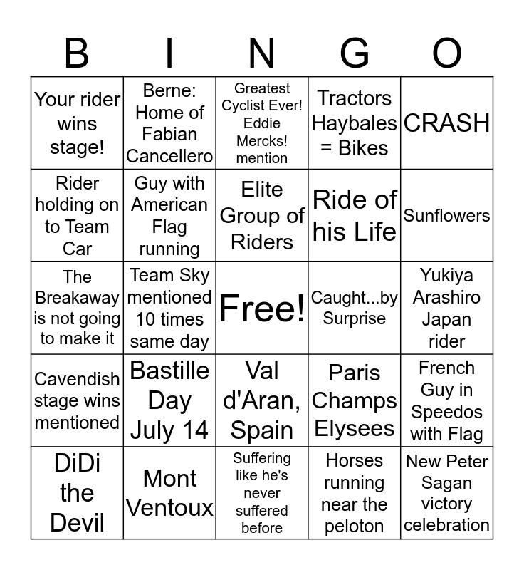 This bingo card has a free space and 24 words: Bastille Day July 14, Mont Ventoux, Elite Group of Riders, DiDi the Devil, CRASH, Your rider wins stage!, Rider holding on to Team Car, Berne: Home of Fabian Cancellero, Caught...by Surprise, Val d'Aran, Spain, Ride of his Life, The Breakaway is not going to make it, Paris Champs Elysees, French Guy in Speedos with Flag, Guy with American Flag running, Horses running near the peloton, Yukiya Arashiro Japan rider, Greatest Cyclist Ever! Eddie Mercks! mention, Sunflowers, Team Sky mentioned 10 times same day, New Peter Sagan victory celebration, Cavendish stage wins mentioned, Tractors Haybales = Bikes and Suffering like he's never suffered before.