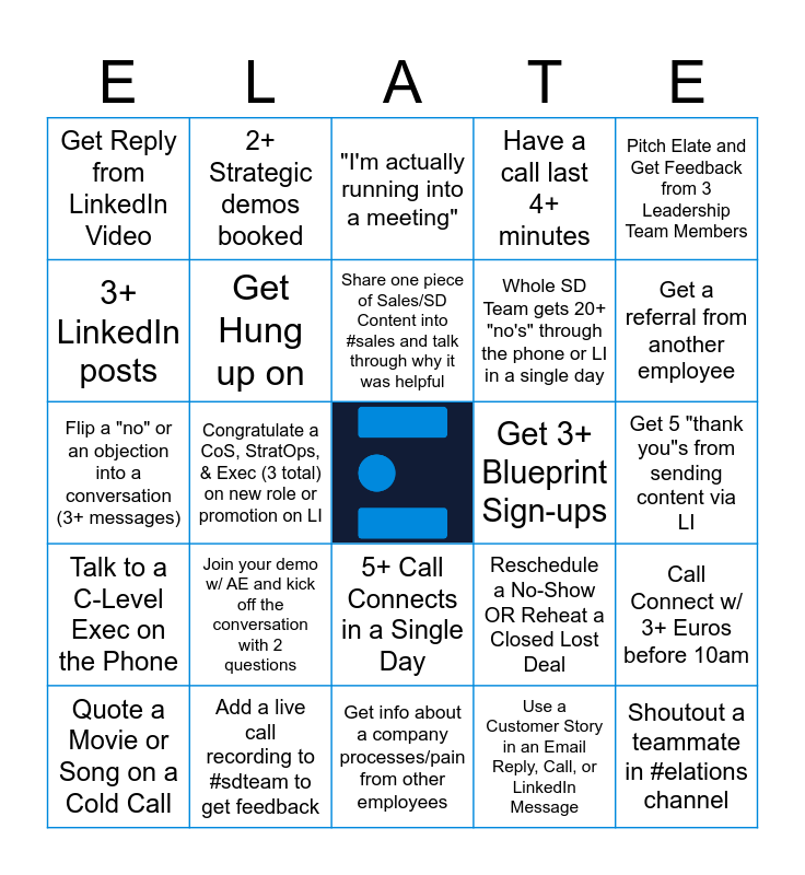 This bingo card has a free space and 24 words: Quote a Movie or Song on a Cold Call, Join your demo w/ AE and kick off the conversation with 2 questions, Share one piece of Sales/SD Content into #sales and talk through why it was helpful, Use a Customer Story in an Email Reply, Call, or LinkedIn Message, Pitch Elate and Get Feedback from 3 Leadership Team Members, Get Reply from LinkedIn Video, 2+ Strategic demos booked, "I'm actually running into a meeting", Get 3+ Blueprint Sign-ups, Get 5 "thank you"s from sending content via LI, Flip a "no" or an objection into a conversation (3+ messages), Get Hung up on, Reschedule a No-Show OR Reheat a Closed Lost Deal, Call Connect w/ 3+ Euros before 10am, 3+ LinkedIn posts, Add a live call recording to #sdteam to get feedback, Get info about a company processes/pain from other employees, Have a call last 4+ minutes, Get a referral from another employee, Talk to a C-Level Exec on the Phone, Congratulate a CoS, StratOps, & Exec (3 total) on new role or promotion on LI, 5+ Call Connects in a Single Day, Whole SD Team gets 20+ "no's" through the phone or LI in a single day and Shoutout a teammate in #elations channel.