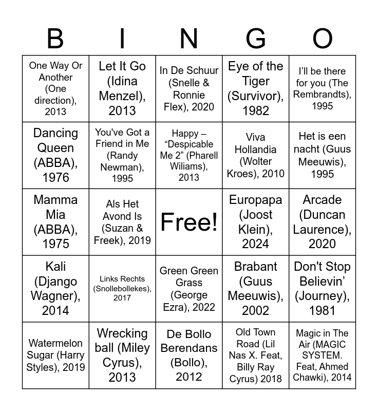 This bingo card has a free space and 48 words: Automatisch (Flemming), 2022, Magic in The Air (MAGIC SYSTEM. Feat, Ahmed Chawki), 2014, Vliegerlied (DD Company), 2017, De Bollo Berendans (Bollo), 2012, Links Rechts (Snollebollekes), 2017, Shake It Off (Taylor Swift), 2014, Let It Go (Idina Menzel), 2013, We Will Rock You (Queen), 1977, Dancing Queen (ABBA), 1976, Baby Shark (Pinkfong kids), 2018, You've Got a Friend in Me (Randy Newman), 1995, Eye of the Tiger (Survivor), 1982, Don't Stop Believin’ (Journey), 1981, Brabant (Guus Meeuwis), 2002, Het SpongeBob SquarePants Lied (SpongeBob SquarePants), 1999, Shape of You (Ed Sheeran), 2017, Happy – “Despicable Me 2” (Pharell Wiliams), 2013, Europapa (Joost Klein), 2024, Entourage (Bankzitters), 2024, I’ll be there for you (The Rembrandts), 1995, Als Het Avond Is (Suzan & Freek), 2019, Old Town Road (Lil Nas X. Feat, Billy Ray Cyrus) 2018, One Way Or Another (One direction), 2013, Viva Hollandia (Wolter Kroes), 2010, Hips don't lie (Shakira), 2005, Het is een nacht (Guus Meeuwis), 1995, Watermelon Sugar (Harry Styles), 2019, Shotgun (George Ezra), 2018, Green Green Grass (George Ezra), 2022, Kali (Django Wagner), 2014, Engelbewaarder (Marco Shuitmaker), 2022, Atje voor de sfeer (René Karst), 2019, Je blik richting mij (Bankzitters), 2022, Firework (Katy Perry), 2010, Wrecking ball (Miley Cyrus), 2013, Sugardaddy (Roxy Dekker), 2024, Alles op Gevoel (Flemming. Feat, Zoë Tauran en Ronny Flex), 2024, Arcade (Duncan Laurence), 2020, Titanium (David Guetta, Feat, Sia) 2011, One Kiss (Calvin Harris & Dua Lipa), 2018, Blue (Da Ba Dee) (Eifel 65), 1999, Hier mag Alles (Marco Shuitmaker & Donnie), 2023, In De Schuur (Snelle & Ronnie Flex), 2020, Loop Niet Weg (Kriss Kross Amsterdam. Feat, Tino Martin & Emma Heesters) , 2020, Mamma Mia (ABBA), 1975, Een ZomerAvond met jou (Monique Smit & Tim Douwsma), 2011, Last Christmas (Wham), 1984 and Jingle Bells (Original) (James Lord Pierpont), 1857.