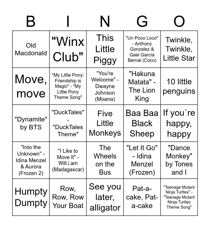 This bingo card has a free space and 39 words: Baby shark, Walking,Walking, "Under the Sea" - The Little Mermaid, "My Little Pony: Friendship is Magic" - "My Little Pony Theme Song", Humpty Dumpty, The Wheels on the Bus, "You're Welcome" - Dwayne Johnson (Moana), "Gravity Falls" - "Gravity Falls Theme Song", Twinkle, Twinkle, Little Star, "Into the Unknown" - Idina Menzel & Aurora (Frozen 2), "DuckTales" - "DuckTales Theme", "Un Poco Loco" - Anthony Gonzalez & Gael García Bernal (Coco), "Teenage Mutant Ninja Turtles" - "Teenage Mutant Ninja Turtles Theme Song", If you`re happy, happy, Baa Baa Black Sheep, "I Like to Move It" - Will.i.am (Madagascar), "Do You Want to Build a Snowman?" - Kristen Bell, Agatha Lee Monn, and Katie Lopez (Frozen), Old Macdonald, Sponge bob - intro, "Let It Go" - Idina Menzel (Frozen), Move, move, See you later, alligator, "Hakuna Matata" - The Lion King, 10 little penguins, "Into the Unknown" - Idina Menzel & Aurora (Frozen 2), "Pokémon" - "Pokémon Theme", "Scooby-Doo, Where Are You!" - Scooby-Doo, Where Are You?, "Happy" - Pharrell Williams, Sailor Moon, "Winx Club", "Teen Titans", "Chip 'n Dale: Rescue Rangers", This Little Piggy, Row, Row, Row Your Boat, Pat-a-cake, Pat-a-cake, Flowers - Miley Cyrus, "Dance Monkey" by Tones and I, "Dynamite" by BTS and Illit - Magnetic.