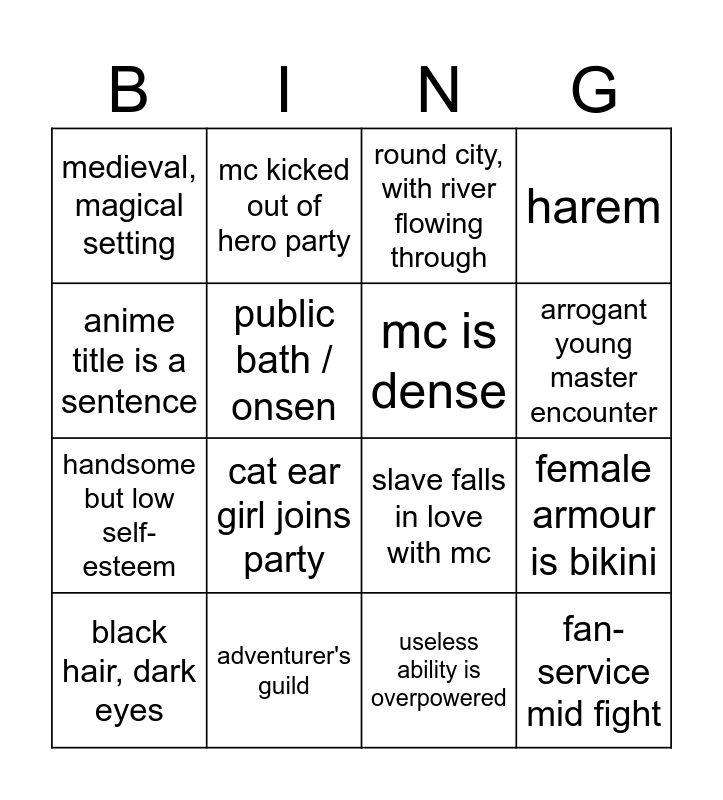 This bingo card has 16 words: adventurer's guild, female armour is bikini, round city, with river flowing through, medieval, magical setting, handsome but low self-esteem, mc kicked out of hero party, slave falls in love with mc, useless ability is overpowered, anime title is a sentence, public bath / onsen, black hair, dark eyes, harem, cat ear girl joins party, arrogant young master encounter, mc is dense and fan-service mid fight.