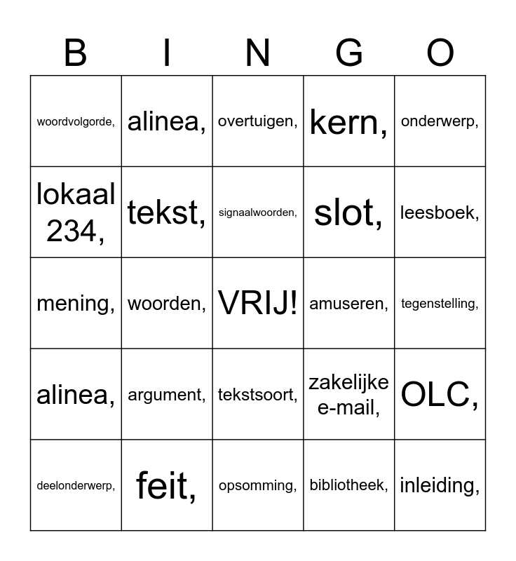 This bingo card has a free space and 33 words: fictie,, lezen,, woorden,, schrijven,, alinea,, tekst,, onderwerp,, deelonderwerp,, alinea,, verwijswoorden,, signaalwoorden,, overtuigen,, activeren,, informeren,, amuseren,, leesboek,, feit,, mening,, argument,, zakelijke e-mail,, tekstsoort,, samenstelling,, woordvolgorde,, tegenstelling,, opsomming,, inleiding,, kern,, slot,, lokaal 234,, OLC,, Lokaal 213B, bibliotheek, and leespubliek.