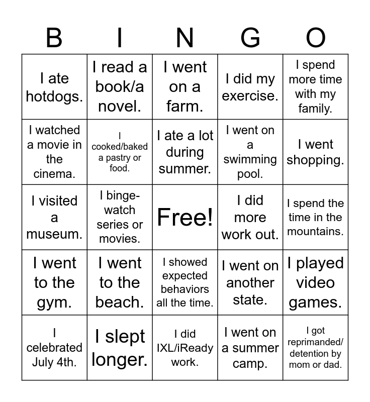 This bingo card has a free space and 24 words: I went to the beach., I slept longer., I ate a lot during summer., I celebrated July 4th., I spend more time with my family., I ate hotdogs., I watched a movie in the cinema., I read a book/a novel., I did more work out., I showed expected behaviors all the time., I went on a swimming pool., I visited a museum., I went on another state., I played video games., I cooked/baked a pastry or food., I went on a summer camp., I spend the time in the mountains., I went on a farm., I went shopping., I binge-watch series or movies., I got reprimanded/ detention by mom or dad., I went to the gym., I did my exercise. and I did IXL/iReady work..