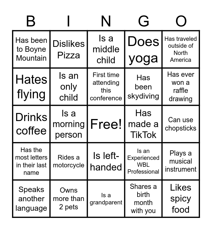 This bingo card has a free space and 24 words: Rides a motorcycle, Owns more than 2 pets, First time attending this conference, Speaks another language, Has traveled outside of North America, Has been to Boyne Mountain, Hates flying, Dislikes Pizza, Has made a TikTok, Is left-handed, Has been skydiving, Drinks coffee, Is an Experienced WBL Professional, Plays a musical instrument, Is an only child, Shares a birth month with you, Can use chopsticks, Is a middle child, Has ever won a raffle drawing, Is a morning person, Likes spicy food, Has the most letters in their last name, Does yoga and Is a grandparent.