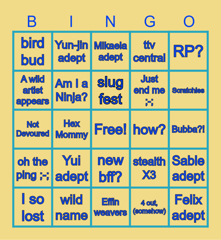 This bingo card has a free space and 24 words: Yui adept, wild name, slug fest, I so lost, RP?, bird bud, A wild artist appears, Yun-jin adept, how?, new bff?, Just end me ;-;, Not Devoured, stealth X3, Sable adept, Am I a Ninja?, 4 out, (somehow), Bubba?!, Mikaela adept, Scratchies, Hex Mommy, Felix adept, oh the ping ;-;, ttv central and Effin weavers.