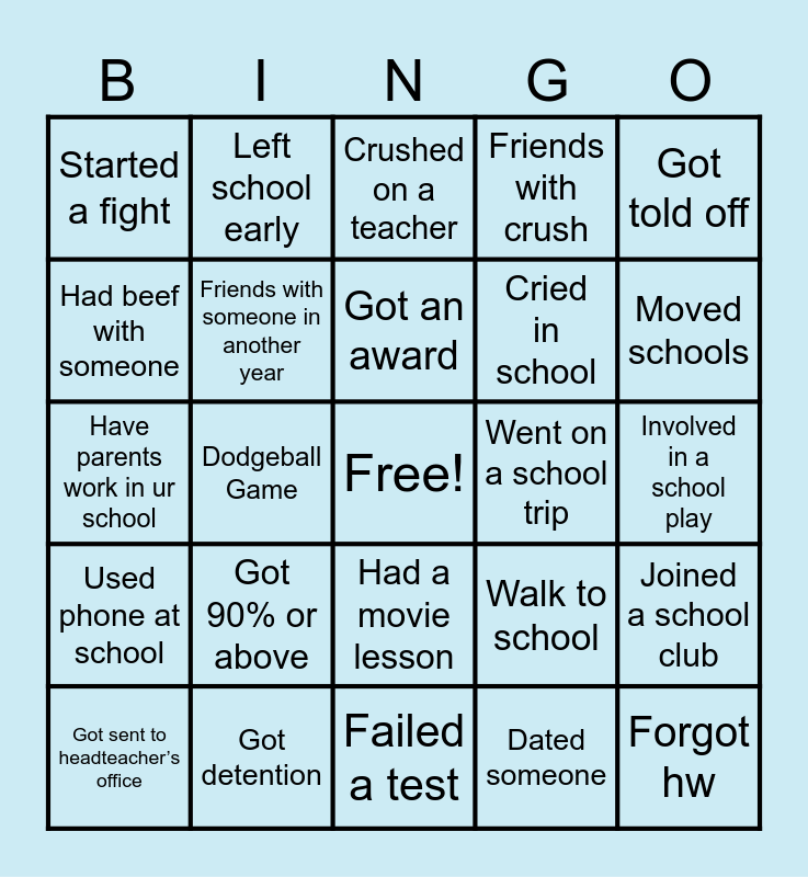 This bingo card has a free space and 24 words: Got 90% or above, Got detention, Got an award, Got sent to headteacher’s office, Got told off, Started a fight, Had beef with someone, Left school early, Went on a school trip, Had a movie lesson, Cried in school, Have parents work in ur school, Walk to school, Joined a school club, Friends with someone in another year, Dated someone, Involved in a school play, Crushed on a teacher, Moved schools, Dodgeball Game, Forgot hw, Used phone at school, Friends with crush and Failed a test.