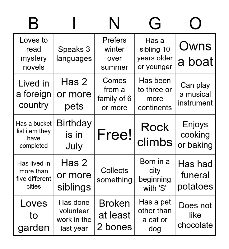 This bingo card has a free space and 46 words: Plays a sport, Does not like chocolate, Can't swim, Broken at least 2 bones, Has 2 or more siblings, Never been on a plane, Speaks 3 languages, Never seen Star Wars, Lived in a foreign country, Knows the planets in order, Has 2 or more pets, Has a sibling 10 years older or younger, Has had funeral potatoes, Born in a city beginning with 'S', Speaks two languages, Chooses salty over sweet, Comes from a family of 6 or more, Rock climbs, Didn’t make their bed today, Owns a boat, Birthday is in July, Has a pet other than a cat or dog, Loves to read mystery novels, Has been to three or more continents, Has a food allergy, Can play a musical instrument, Loves to garden, Has run a marathon, Collects something, Has lived in more than five different cities, Prefers tea over coffee, Has a favorite superhero, Has been on TV or radio, Can drive a manual transmission car, Knows how to juggle, Has done volunteer work in the last year, Enjoys cooking or baking, Has never broken a bone, Is left-handed, Has a tattoo, Is an only child, Prefers winter over summer, Has a bucket list item they have completed, Is afraid of heights, Loves spicy food and Has been in a play or musical.