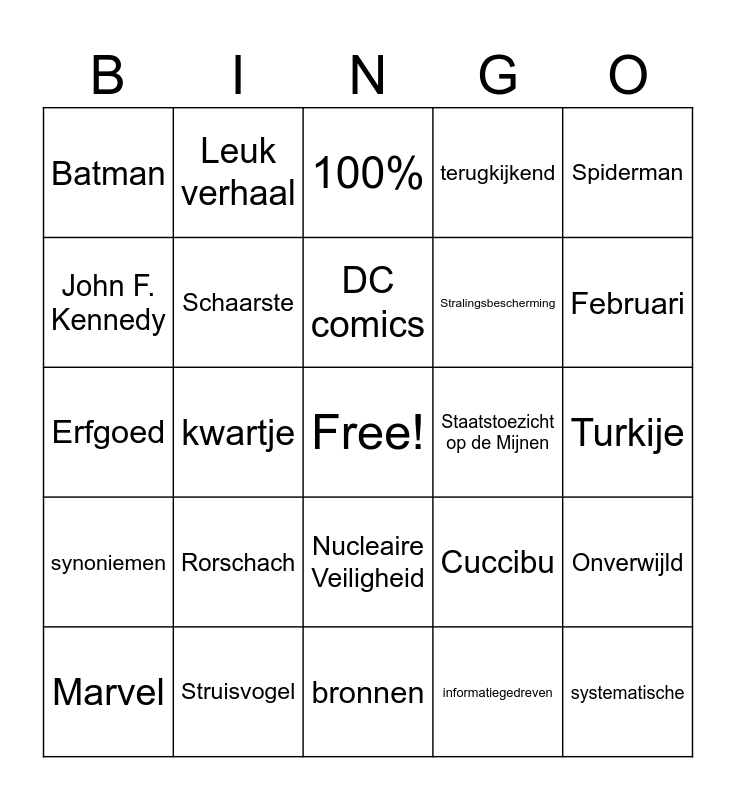 This bingo card has a free space and 24 words: Rorschach, Struisvogel, DC comics, Marvel, Spiderman, Batman, John F. Kennedy, Leuk verhaal, Staatstoezicht op de Mijnen, Nucleaire Veiligheid, Stralingsbescherming, Erfgoed, Cuccibu, Onverwijld, Schaarste, informatiegedreven, Turkije, 100%, Februari, kwartje, systematische, synoniemen, terugkijkend and bronnen.