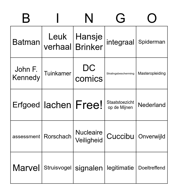 This bingo card has a free space and 24 words: Rorschach, Struisvogel, DC comics, Marvel, Spiderman, Batman, John F. Kennedy, Leuk verhaal, Staatstoezicht op de Mijnen, Nucleaire Veiligheid, Stralingsbescherming, Erfgoed, Cuccibu, Onverwijld, Tuinkamer, legitimatie, Nederland, Hansje Brinker, Masteropleiding, lachen, Doeltreffend, assessment, integraal and signalen.