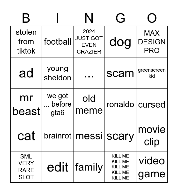 This bingo card has a free space and 24 words: brainrot, edit, ..., SML VERY RARE SLOT, MAX DESIGN PRO, stolen from tiktok, ad, football, ronaldo, messi, scam, mr beast, scary, movie clip, young sheldon, KILL ME KILL ME KILL ME KILL ME KILL ME, cursed, 2024 JUST GOT EVEN CRAZIER, greenscreen kid, we got ... before gta6, video game, cat, dog and family.
