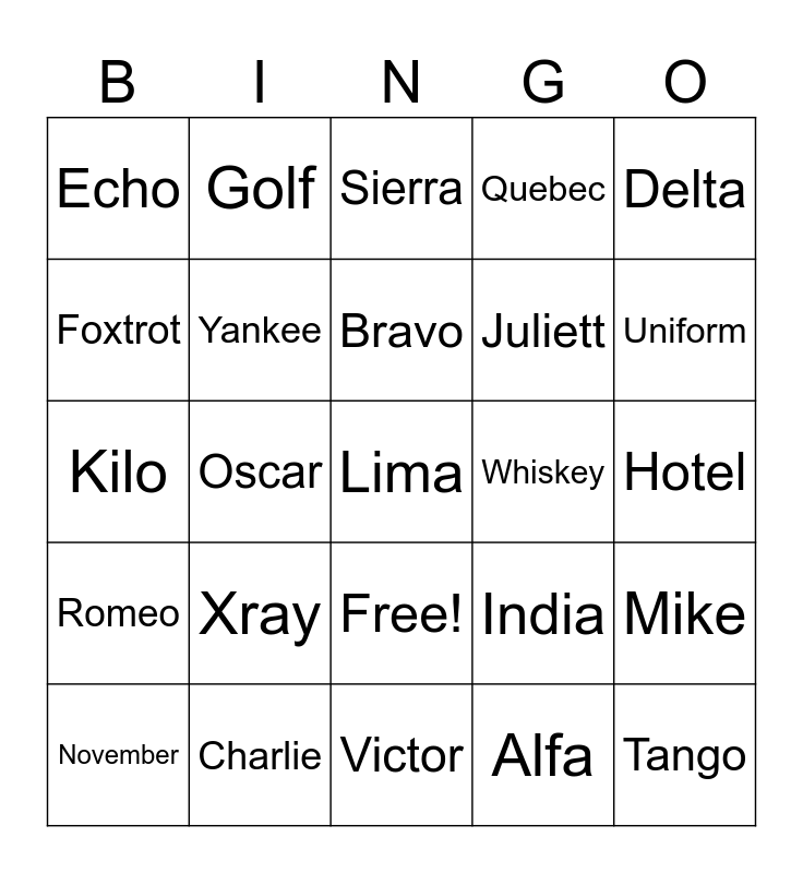 This bingo card has a free space and 26 words: Free!, Alfa, Bravo, Charlie, Delta, Echo, Foxtrot, Golf, Hotel, India, Juliett, Kilo, Mike, November, Oscar, Papa, Quebec, Romeo, Sierra, Tango, Uniform, Victor, Whiskey, Xray, Yankee and Zulu.