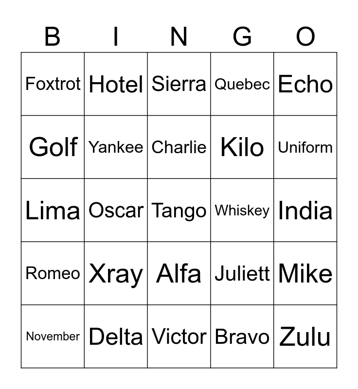 This bingo card has 26 words: Alfa, Bravo, Charlie, Delta, Echo, Foxtrot, Golf, Hotel, India, Juliett, Kilo, Lima, Mike, November, Oscar, Papa, Quebec, Romeo, Sierra, Tango, Uniform, Victor, Whiskey, Xray, Yankee and Zulu.