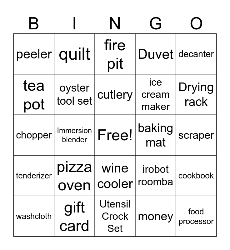 This bingo card has a free space and 110 words: All purpose bowl, bakeware, baking mat, baking sheet, bath towel, BBQ tools, blanket, blender, brush, bud vase, caddy, cake stand, candle holder, champagne flutes, Charger, cheese cutter, chopper, citrus squeezer, Coffee grinder, colander, cookbook, cooler, corkscrew, crème brulee dishes, Cups, cutlery, decanter, Decorating kit, dip bowl or set, dough scoop, Drying rack, Duvet, fire pit, flatware, food carrier, food processor, frying pan, garlic mincer, gift card, Gravy boat, griddle, handcloth, ice cream maker, Immersion blender, irobot roomba, kitchen aid mixer, kitchen aid mixer accessories, lazy susan, le Creuset, mandoline, Marinating Tray set, measuring spoon, money, mugs, napkin rings, napkins, old fashioned glasses, olive oil cruet, Oven Mitt or Pot Holder, oyster tool set, peeler, photo printer, picnic basket, Pitcher, pitcher, pizza oven, pizza stone, place card holder, placemat, Plates, Platter, powdered sugar shaker, quilt, ramekin, roaster, rug, salt & pepper mill, scraper, Serving Board, Serving bowl, serving set, Sheet Set, soup bowl, spatulas, speaker, Stemware, storage container, storage set, Strainer, table runner, tablecloth, tea pot, Tea towel, tenderizer, three tiered stand, throw, trifle bowl, trivit, tumblers, Utensil Crock Set, vacuum, vase, waffle maker, washcloth, wine cooler, wine glasses, Wine Rack, wood sppons, cookware and steamer.