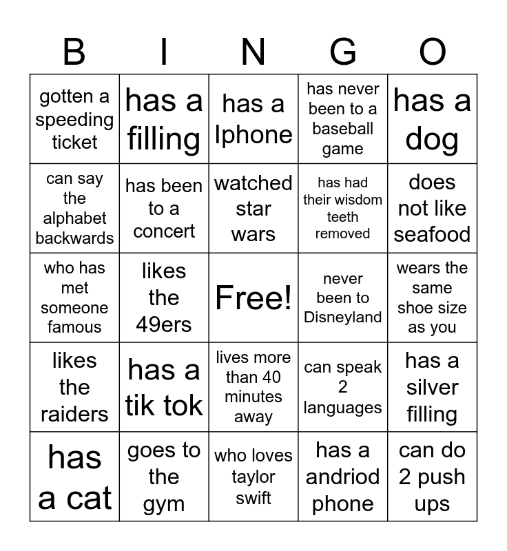This bingo card has a free space and 24 words: has a tik tok, goes to the gym, watched star wars, has a cat, has a dog, gotten a speeding ticket, can say the alphabet backwards, has a filling, never been to Disneyland, lives more than 40 minutes away, has had their wisdom teeth removed, who has met someone famous, can speak 2 languages, has a silver filling, has been to a concert, has a andriod phone, wears the same shoe size as you, has a Iphone, does not like seafood, likes the 49ers, can do 2 push ups, likes the raiders, has never been to a baseball game and who loves taylor swift.