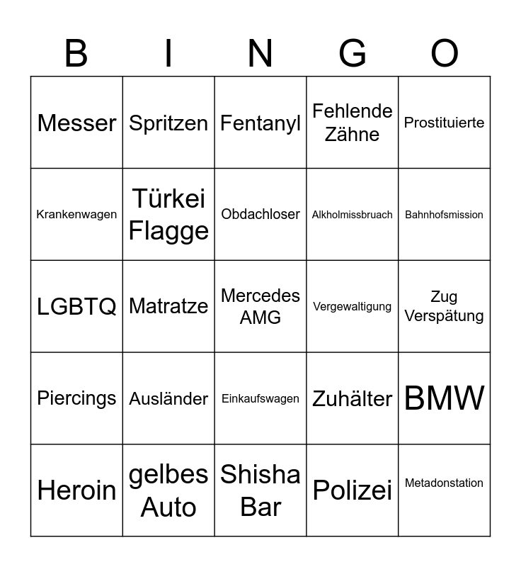 This bingo card has a free space and 24 words: Heroin, Ausländer, Obdachloser, Polizei, Prostituierte, Messer, Spritzen, Fentanyl, Vergewaltigung, Zug Verspätung, LGBTQ, Türkei Flagge, Zuhälter, BMW, Krankenwagen, gelbes Auto, Shisha Bar, Fehlende Zähne, Bahnhofsmission, Piercings, Matratze, Einkaufswagen, Alkholmissbruach and Metadonstation.