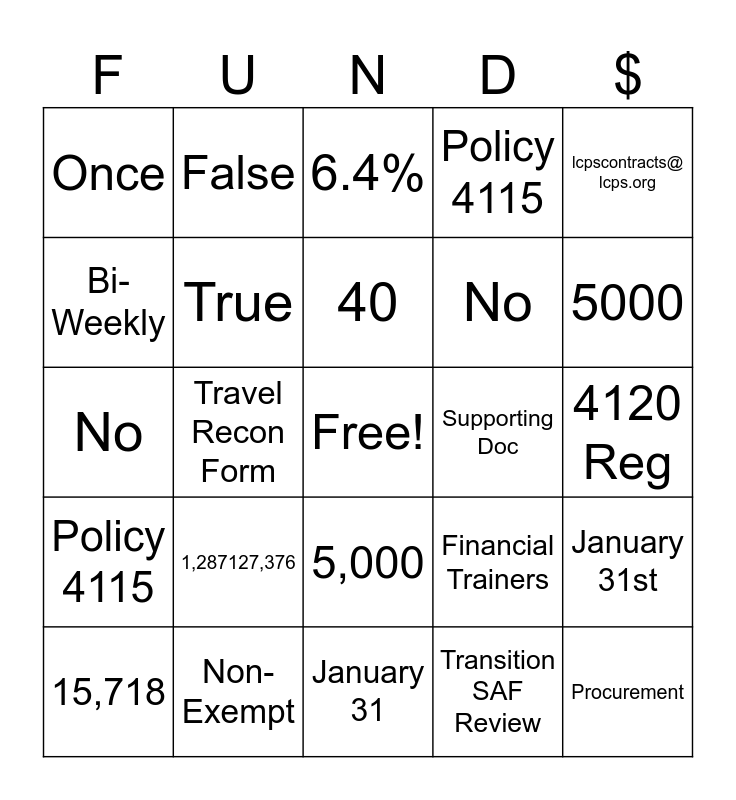 This bingo card has a free space and 49 words: W-4, Procurement, 2, January 31, 1,287127,376, LCPS Intranet, False, Financial Services, Bi-Weekly, Principal, True, Policy 4115, January 31st, Financial Trainers, $100, 12,235.3, 40, Supporting Doc, 1, lcpscontracts@ lcps.org, Travel Recon Form, Transition SAF Review, Once, No, 30, 5000, 15,718, Financial Services, 5,000, Policy 4115, LCPS Intranet, 13,728.80, Checks distributed evenly, Annual in July, Non-Exempt, Contingency Staffing, Self Insurance Fund, 2, 4120 Reg, June 30th, Tech Contract, Financial Trainers, 98, 30, No, 6.4%, Once, FRC, left side and LCPS Intranet.