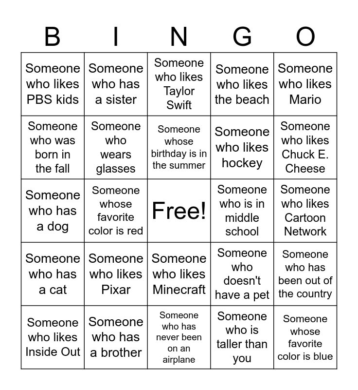 This bingo card has a free space and 24 words: Someone who likes Pixar, Someone who has a brother, Someone whose birthday is in the summer, Someone who likes Inside Out, Someone who likes Mario, Someone who likes PBS kids, Someone who was born in the fall, Someone who has a sister, Someone who is in middle school, Someone who likes Minecraft, Someone who likes hockey, Someone who has a dog, Someone who doesn't have a pet, Someone who has been out of the country, Someone who wears glasses, Someone who is taller than you, Someone who likes Cartoon Network, Someone who likes Taylor Swift, Someone who likes Chuck E. Cheese, Someone whose favorite color is red, Someone whose favorite color is blue, Someone who has a cat, Someone who likes the beach and Someone who has never been on an airplane.