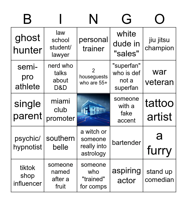 This bingo card has a free space and 24 words: southern belle, someone named after a fruit, 2 houseguests who are 55+, tiktok shop influencer, jiu jitsu champion, ghost hunter, semi-pro athlete, law school student/ lawyer, someone with a fake accent, a witch or someone really into astrology, "superfan" who is def not a superfan, single parent, bartender, a furry, nerd who talks about D&D, aspiring actor, tattoo artist, personal trainer, war veteran, miami club promoter, stand up comedian, psychic/ hypnotist, white dude in "sales" and someone who "trained" for comps.