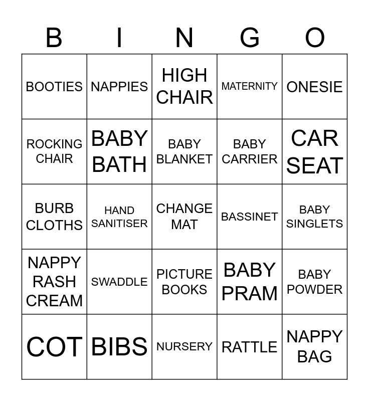 This bingo card has 30 words: COT, BOTTLE, BABY BLANKET, DUMMY, ONESIE, BOOTIES, NAPPIES, PICTURE BOOKS, BASSINET, NAPPY BAG, NAPPY RASH CREAM, BABY BATH, Free!, RATTLE, BABY POWDER, WIPES, HAND SANITISER, CHANGE MAT, BABY PRAM, CAR SEAT, BURB CLOTHS, BIBS, HIGH CHAIR, BABY CARRIER, BABY SINGLETS, ROCKING CHAIR, SWADDLE, NURSERY, MATERNITY and BREAST PUMP.