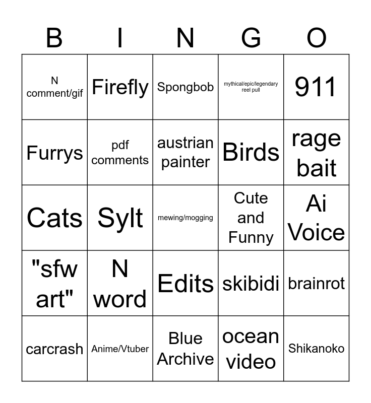 This bingo card has a free space and 24 words: N word, Anime/Vtuber, austrian painter, carcrash, 911, N comment/gif, Furrys, Firefly, Cute and Funny, Edits, Birds, Cats, skibidi, brainrot, pdf comments, ocean video, Ai Voice, Spongbob, rage bait, Sylt, Shikanoko, "sfw art", mythical/epic/legendary reel pull and Blue Archive.