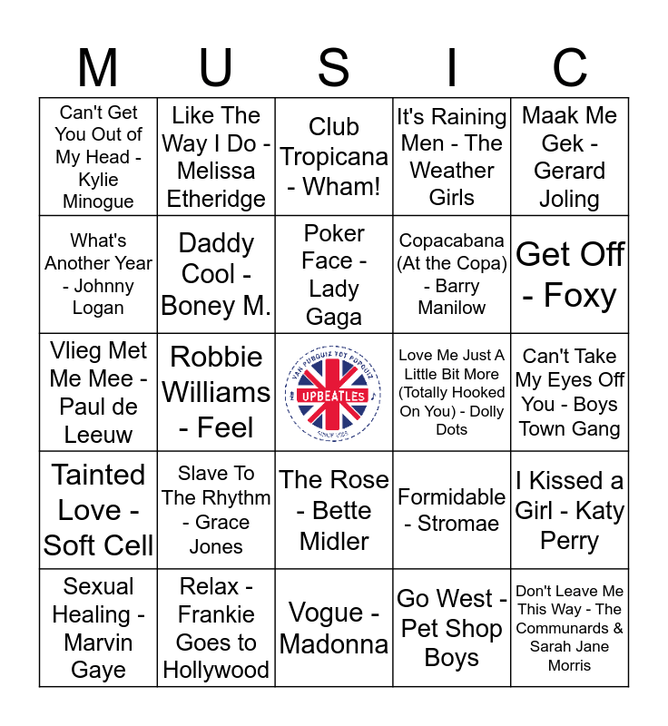 This bingo card has a free space and 24 words: Slave To The Rhythm - Grace Jones, Relax - Frankie Goes to Hollywood, Poker Face - Lady Gaga, Sexual Healing - Marvin Gaye, Maak Me Gek - Gerard Joling, Can't Get You Out of My Head - Kylie Minogue, What's Another Year - Johnny Logan, Like The Way I Do - Melissa Etheridge, Love Me Just A Little Bit More (Totally Hooked On You) - Dolly Dots, The Rose - Bette Midler, Copacabana (At the Copa) - Barry Manilow, Vlieg Met Me Mee - Paul de Leeuw, Formidable - Stromae, I Kissed a Girl - Katy Perry, Daddy Cool - Boney M., Go West - Pet Shop Boys, Can't Take My Eyes Off You - Boys Town Gang, Club Tropicana - Wham!, Get Off - Foxy, Robbie Williams - Feel, Don't Leave Me This Way - The Communards & Sarah Jane Morris, Tainted Love - Soft Cell, It's Raining Men - The Weather Girls and Vogue - Madonna.