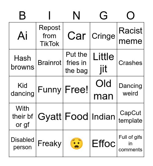 This bingo card has a free space and 24 words: Gyatt, Freaky, Put the fries in the bag, Disabled person, Racist meme, Ai, Hash browns, Repost from TikTok, Old man, Food, Little jit, Kid dancing, Indian, CapCut template, Brainrot, Effoc, Dancing weird, Car, Crashes, Funny, Full of gifs in comments, With their bf or gf, Cringe and 😧.