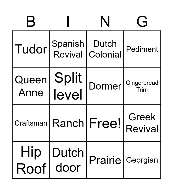 This bingo card has 19 words: Free!, Cape Cod, Dutch Colonial, Georgian, Greek Revival, Queen Anne, Prairie, Tudor, Spanish Revival, Craftsman, Ranch, Split level, Dormer, Dutch door, Hip Roof, Dentil molding, Pediment, Gingerbread Trim and Half timbering.