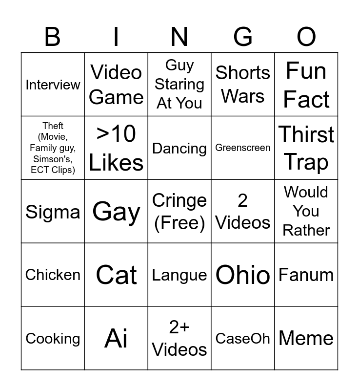 This bingo card has a free space and 24 words: Cat, Ai, Dancing, Cooking, Fun Fact, Interview, Theft (Movie, Family guy, Simson's, ECT Clips), Video Game, 2 Videos, Langue, Greenscreen, Sigma, Ohio, Fanum, >10 Likes, CaseOh, Would You Rather, Guy Staring At You, Thirst Trap, Gay, Meme, Chicken, Shorts Wars and 2+ Videos.