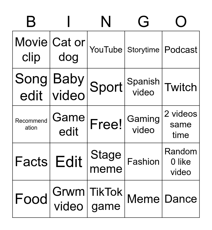 This bingo card has a free space and 24 words: Edit, Grwm video, Sport, Food, Podcast, Movie clip, Song edit, Cat or dog, Gaming video, Stage meme, Spanish video, Recommend ation, Fashion, Random 0 like video, Baby video, Meme, 2 videos same time, YouTube, Twitch, Game edit, Dance, Facts, Storytime and TikTok game.