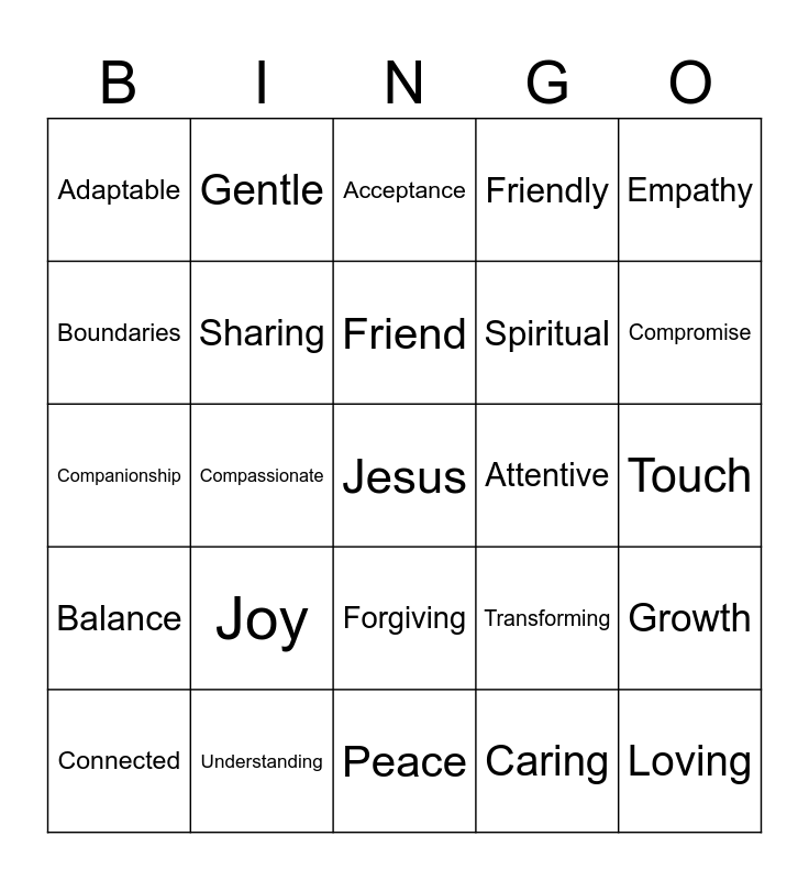 This bingo card has a free space and 51 words: Trust, Loving, Patience, Peace, Joy, Self-Control, Gentle, Respect, Boundaries, Submit, Sharing, Friendly, Growth, Transforming, Confident, Honoring, Friend, Attentive, Giving, Empathy, Compassionate, Caring, Adaptable, Spiritual, Shared Values, Open Communication, Compromise, Supportive, Connected, Acceptance, Appreciation, Intimate, Commitment, Harmony, Time, Understanding, Equity, Safety, Flexibility, Loyal, Touch, Balance, Kindness, Dependability, Mutual Goals, Teamwork, Companionship, Collaboration, Trustworthy, Forgiving and Openness.