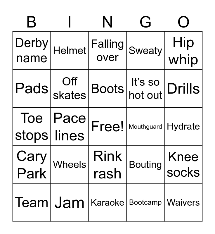 This bingo card has a free space and 24 words: Wheels, Jam, Boots, Team, Hip whip, Derby name, Pads, Helmet, Mouthguard, Rink rash, It’s so hot out, Toe stops, Bouting, Knee socks, Off skates, Bootcamp, Hydrate, Falling over, Drills, Pace lines, Waivers, Cary Park, Sweaty and Karaoke.