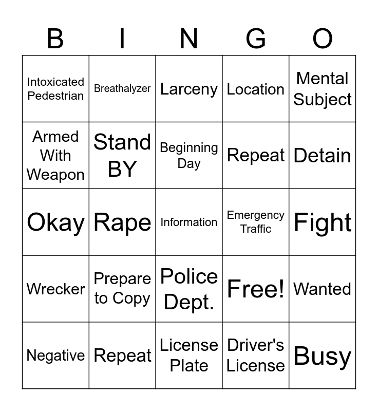 This bingo card has 25 words: Prepare to Copy, License Plate, Beginning Day, Negative, Mental Subject, Intoxicated Pedestrian, Armed With Weapon, Breathalyzer, Emergency Traffic, Police Dept., Repeat, Okay, Free!, Wanted, Stand BY, Busy, Fight, Larceny, Detain, Rape, Information, Repeat, Wrecker, Location and Driver's License.