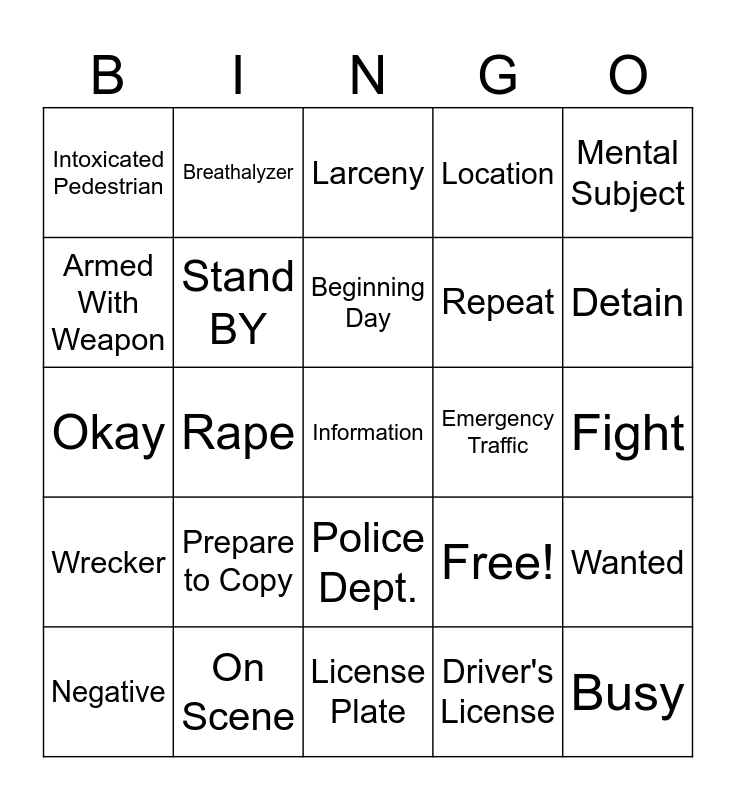This bingo card has 25 words: Prepare to Copy, License Plate, Beginning Day, Negative, Mental Subject, Intoxicated Pedestrian, Armed With Weapon, Breathalyzer, Emergency Traffic, Police Dept., Repeat, Okay, Free!, Wanted, Stand BY, Busy, Fight, Larceny, Detain, Rape, Information, On Scene, Wrecker, Location and Driver's License.