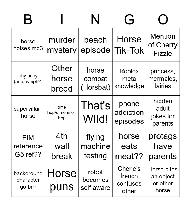 This bingo card has a free space and 58 words: LGBT+ Rep, Horse puns, Mild Manes, FIM reference G5 ref??, Cherie's french confuses other, disabled horse, Other horse breed, Man horse, Roblox meta knowledge, Random small thing ending the world, Horse Tik-Tok, Economics, IRL Celeb reference, Anime Openning, Magical girl reference, horse noises.mp3, Horse bites an object or other horse, Mention of Cherry Fizzle, Crime, horse combat (Horsbat), phone addiction episodes, beach episode, background character go brrr, protags have parents, coming out episode, hidden adult jokes for parents, furry rep, pet episode, princess, mermaids, fairies, horse famous VA Cameo, Candi central episode, batman but horse, cherie & Friends visit prance, friendship broken, candi talks to the audience like fans, body positivity ep, drag queen pone, time hop/dimension hop, supervillain horse, horse mech (transformer horse), 4th wall break, stole a plot from G5 or FIM, horse eats meat??, Lyra pone (standing on two legs), detective episode, cooking competition, horse holiday, flying machine testing, robot becomes self aware, fandom reference episode, Winsol reference?, autism awareness episode, fashion showdown, weirdly out of place sad/dark ep, murder mystery, episode about magical girls, shy pony (antonymph?) and OC Clone.