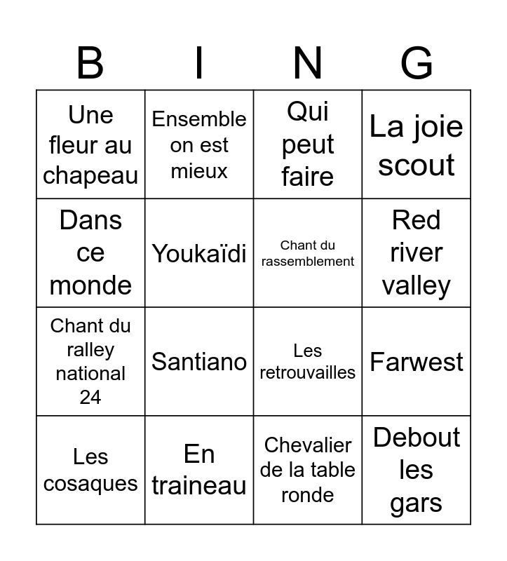 This bingo card has 16 words: En traineau, Farwest, Qui peut faire, Une fleur au chapeau, Chant du ralley national 24, Ensemble on est mieux, Les retrouvailles, Chevalier de la table ronde, Dans ce monde, Youkaïdi, Les cosaques, La joie scout, Santiano, Red river valley, Chant du rassemblement and Debout les gars.