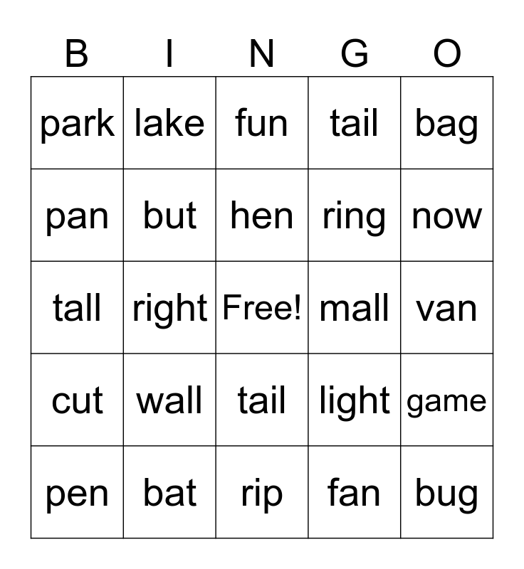 This bingo card has a free space and 29 words: pen, cow, right, night, park, fun, but, wall, mall, bat, van, bug, rip, fan, now, lip, tail, cut, bag, tall, light, net, ring, pan, tail, lake, game, hen and cold.