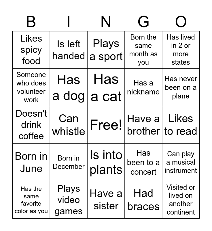 This bingo card has a free space and 24 words: Born in December, Plays video games, Has a cat, Has the same favorite color as you, Has lived in 2 or more states, Likes spicy food, Someone who does volunteer work, Is left handed, Have a brother, Is into plants, Has a nickname, Doesn't drink coffee, Has been to a concert, Can play a musical instrument, Has a dog, Had braces, Likes to read, Plays a sport, Has never been on a plane, Can whistle, Visited or lived on another continent, Born in June, Born the same month as you and Have a sister.