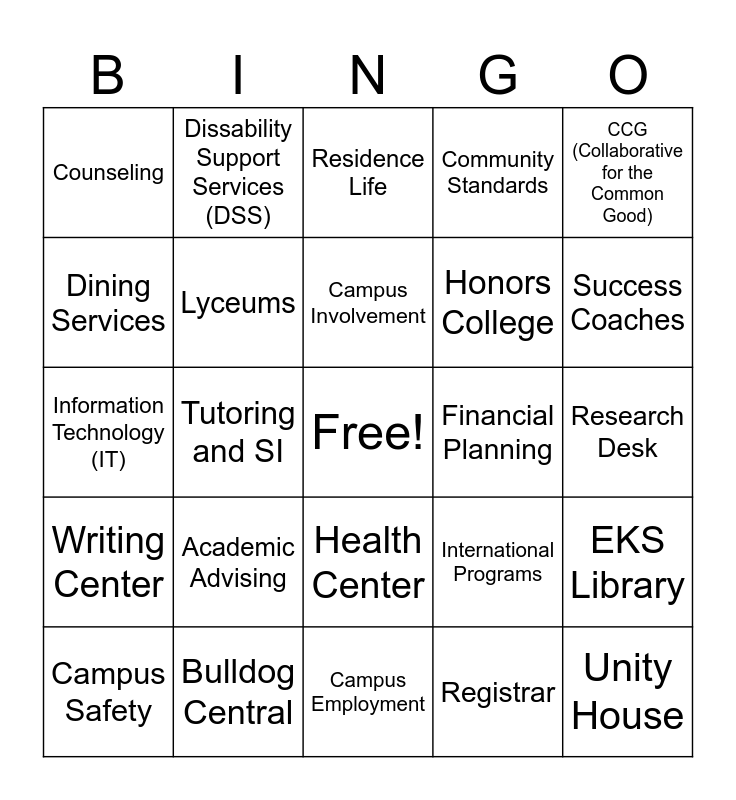 This bingo card has a free space and 24 words: Academic Advising, Bulldog Central, Campus Involvement, Campus Safety, CCG (Collaborative for the Common Good), Counseling, Dining Services, Dissability Support Services (DSS), Financial Planning, Health Center, Honors College, Information Technology (IT), International Programs, EKS Library, Lyceums, Registrar, Research Desk, Residence Life, Success Coaches, Tutoring and SI, Unity House, Writing Center, Community Standards and Campus Employment.