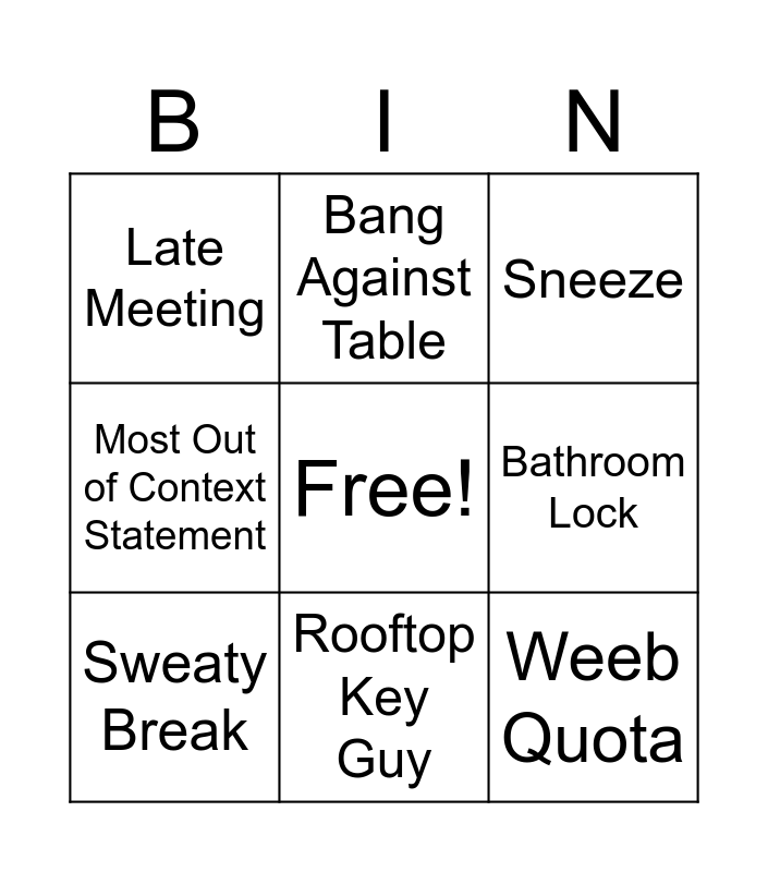 This bingo card has a free space and 8 words: Bathroom Lock, Sneeze, Bang Against Table, Sweaty Break, Late Meeting, Weeb Quota, Most Out of Context Statement and Rooftop Key Guy.